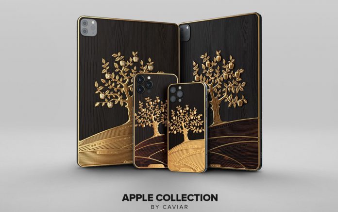 Desta vez, a Caviar interpretou as coisas um pouco literalmente e substituiu o logotipo da Apple nas costas de vários iPhones e iPads por uma macieira inteira. Uma macieira feita de ouro e colocada sobre um fundo de madeira de macieira escurecida.