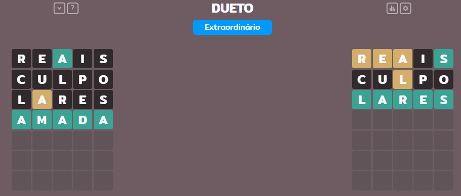Vale ressaltar que todos jogam a mesma palavra, ou seja, caso você revele a palavra nas suas redes sociais, outras pessoas podem receber o spoiler dela. Abaixo você pode conferir a palavra de hoje do termo dueto.